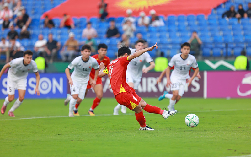 Thế trận chỉ được khai thông ở phút 18. Lê Phát bứt tốc xâm nhập vòng cấm, buộc hậu vệ Kyrgyzstan phạm lỗi. Trên chấm phạt đền, đội trưởng Khuất Văn Khang dứt điểm chính xác, mở tỷ số cho U23 Việt Nam.